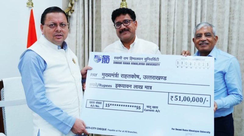 देहरादून। मुख्यमंत्री पुष्कर सिंह धामी से मुख्यमंत्री आवास में स्वामी राम हिमालयन यूनिवर्सिटी के प्रतिनिधिमंडल ने भेंट की। इस दौरान स्वामी राम हिमालयन यूनिवर्सिटी द्वारा उत्तरकाशी जिले के धराली एवं हर्षिल क्षेत्र में आई आपदा के राहत कार्यों के लिए मुख्यमंत्री राहत कोष में ₹ 51 लाख की धनराशि का योगदान दिया गया।