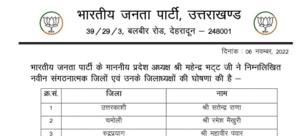 उत्तराखंड भाजपा प्रदेश अध्यक्ष महेन्द्र भट्ट ने की देहरादून सहित 19 जिलों के जिलाध्यक्षों की घोषणा