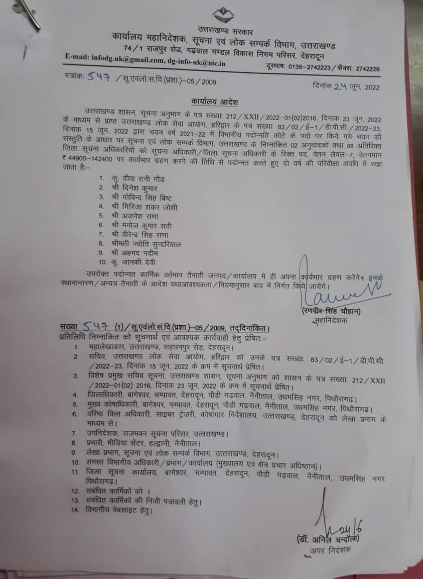 जिन कार्मिकों को सूचना अधिकारी/जिला सूचना अधिकारी के पद पर पदोन्नत किया गया है उनमें कु. दीपा रानी गौड़, दिनेश कुमार, गोविन्द सिंह बिष्ट, गिरिजा शंकर जोशी, अजनेश राणा, मनोज कुमार सती, वीरेन्द्र सिंह राणा, ज्योति सुन्दरियाल, अहमद नदीम तथा कु. जानकी देवी शामिल हैं।