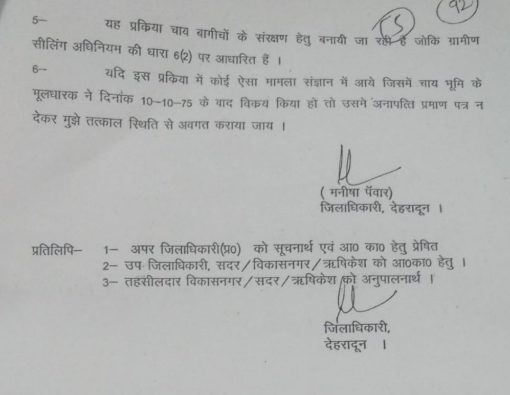 आरटीआई एक्टिविस्ट विकेश नेगी ने बताया कि सुुप्रीम कोर्ट ने भी यही व्यवस्था की थी। उन्होंने कहा कि सीलिंग एक्ट के तहत देहरादून और विकासनगर की कुल 424.381 हेक्टेयर यानी लगभग 5500 बीघा जमीन चाय बागान की है। सीलिंग की जमीन को लेकर विभाग ने तहसीलदार से भी जवाब मांगा लेकिन विभाग को कोई जवाब नहीं दिया गया। एडवोकेट विकेश नेगी के अनुसार इस संबंध में अध्यादेश को भी छिपा कर रखा गया। उन्होंने बताया कि चाय बागान की जमीन को लेकर यूपी अध्यादेश संख्या 31 सन् 1975 द्वारा 10 अक्टूबर 1975 से ऐसी भूमि के नामांकरण और बिक्रय पर रोक लगाई गई तथा ग्रामीण सीलिंग अधिनियम की धारा 6 [2] के उल्घंन पर धारा 6 [3] के तहत ऐसे अतंरण/नामांकरण/ ब्रिकय को सून्य कर राज्यसात किये जाने का नियम स्थापित हुआ था। उन्होंने सूचना के अधिकार अधिनियम के तहत जानकारी मांगी तो अध्यादेश छिपाने का खुलासा हो गया।