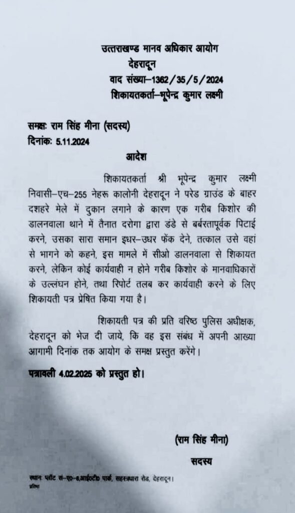 मानवाधिकार, आरटीआई और सामाजिक कार्यकर्ता भूपेन्द्र कुमार लक्ष्मी द्वारा उपरोक्त मामले में मानवाधिकार आयोग उत्तराखंड में जनहित याचिका दायर कर निवेदन किया गया कि “देहरादून के परेड ग्राउंड के बाहर दशहरे मेले में दुकान लगाने के लिए गए एक गरीब किशोर की डालनवाला थाने में तैनात दरोगा द्वारा डंडे से बर्बरतापूर्वक पिटाई की गई और इतना ही नहीं उस गरीब किशोर का सारा सामान भी उस दरोगा ने इधर उधर फेंक दिया और उसे तत्काल वहां से भागने को कहा”।
