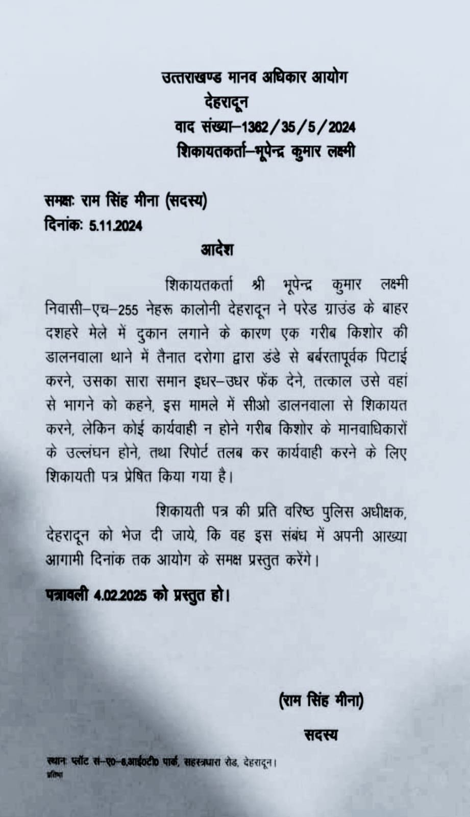 शिकायती पत्र की प्रति वरिष्ठ पुलिस अधीक्षक, देहरादून को भेज दी जाए, कि वह इस संबंध में अपनी आख्या आगामी दिनांक तक आयोग के समक्ष प्रस्तुत करेंगे।