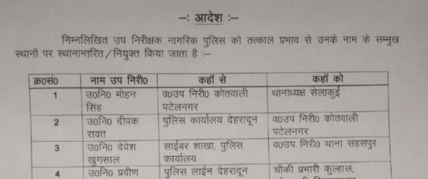 देहरादून: डीआईजी/वरिष्ठ पुलिस अधीक्षक ने किए निम्न सब इंस्पेक्टरों के ट्रांसफर।