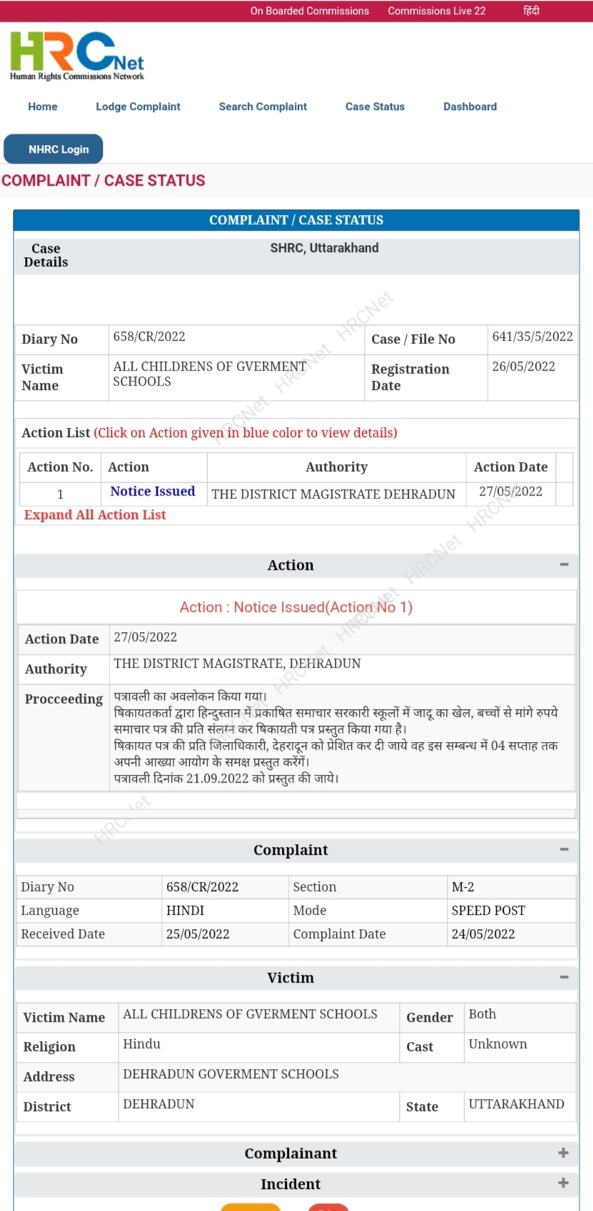 मानव अधिकार आयोग उत्तराखंड द्वारा जनहित याचिका की सुनवाई करते हुए जिलाधिकारी देहरादून को नोटिस जारी कर 4 सप्ताह में प्रकरण से संबंधित आख्या मांगी गई है
