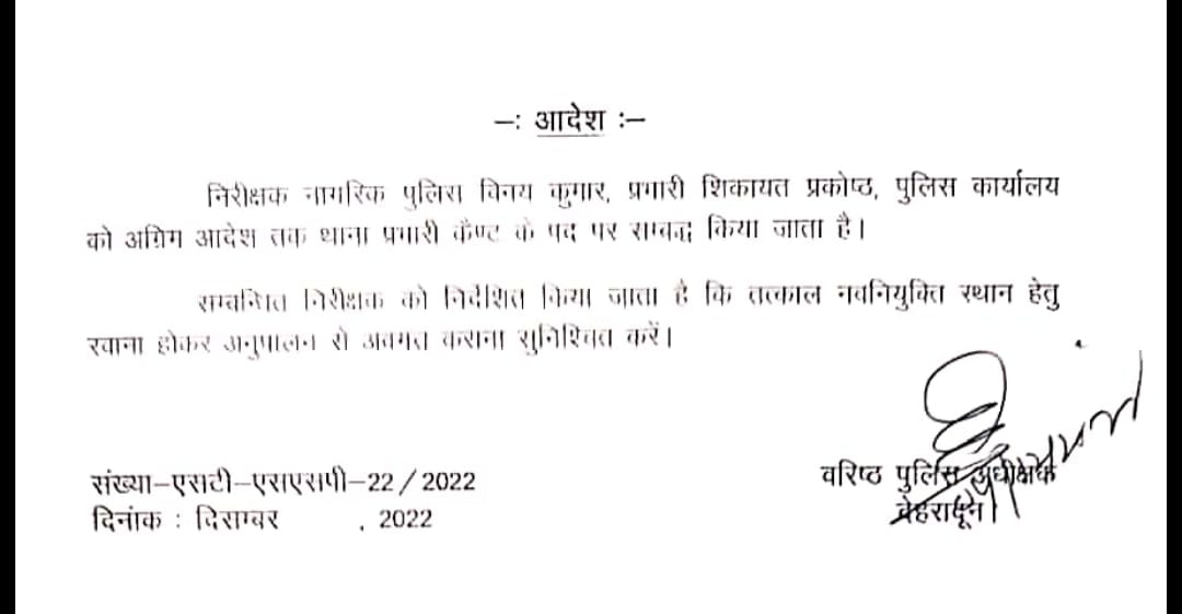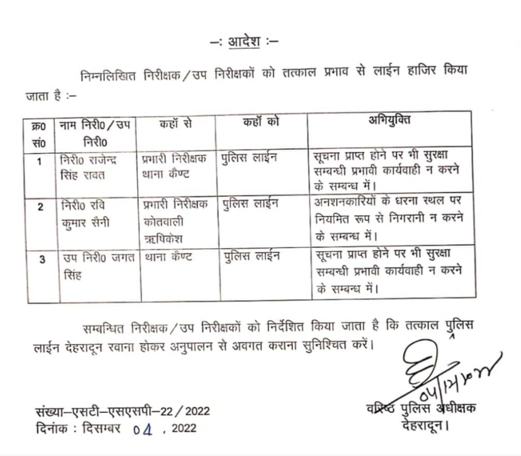 देहरादून: SSP ने किए 2 कोतवाली थाने के 2 इंस्पेक्टर 1 सब इंस्पेक्टर लाईन हाजिर और एक इंस्पेक्टर को सौंपा थाना कैंट का चार्ज