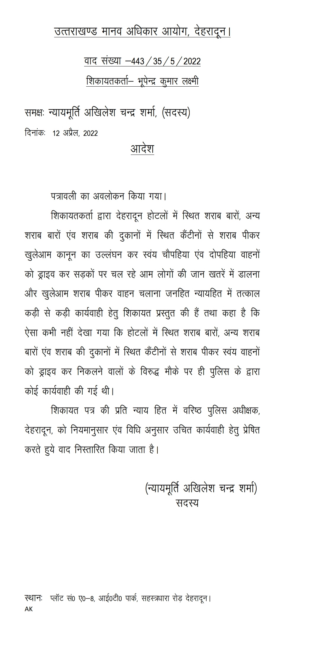उत्तराखंड मानवाधिकार आयोग के सदस्य न्यायमूर्ति अखिलेश चंद शर्मा द्वारा शिकायत की गंभीरता को देखते हुए तत्काल सुनवाई की गई तथा आदेश जारी किए गए कि शिकायतकर्ता द्वारा देहरादून होटलों में स्थित शराब बारों, अन्य शराब बारों एंव शराब की दुकानों में स्थित कैंटीनों से शराब पीकर खुलेआम कानून का उल्लंघन कर स्वंय चैपहिया एंव दोपहिया वाहनों को ड्राइव कर सड़कों पर चल रहे आम लोगों की जान खतरें में डालना और खुलेआम शराब पीकर वाहन चलाना जनहित न्यायहित में तत्काल कड़ी से कड़ी कार्यवाही हेतु शिकायत प्रस्तुत की हैं तथा कहा है कि ऐसा कभी नहीं देखा गया कि होटलों में स्थित शराब बारों, अन्य शराब बारों एंव शराब की दुकानों में स्थित कैंटीनों से शराब पीकर स्वंय वाहनों को ड्राइव कर निकलने वालों के विरुद्ध मौके पर ही पुलिस के द्वारा कोई कार्यवाही की गई थी।न्यायहित में वरिश्ठ पुलिस अधीक्षक, देहरादून, को नियमानुसार एंव विधि अनुसार उचित कार्यवाही हेतु निर्देशित किया जाता हैं ।