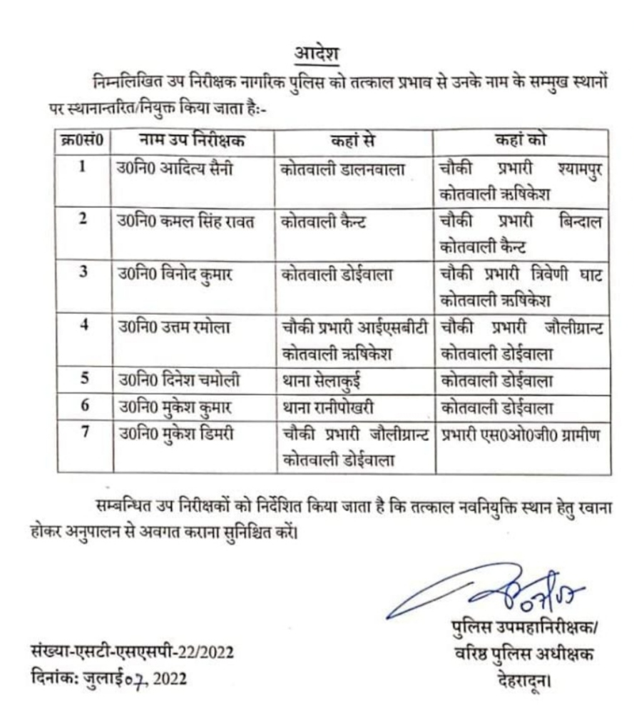 डीआईजी /एसएसपी देहरादून जन्मेजय खंडूरी ने किए निम्न सब इंस्पेक्टरों के ट्रांसफर।