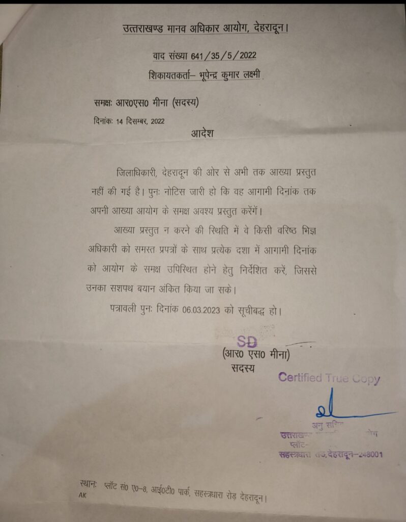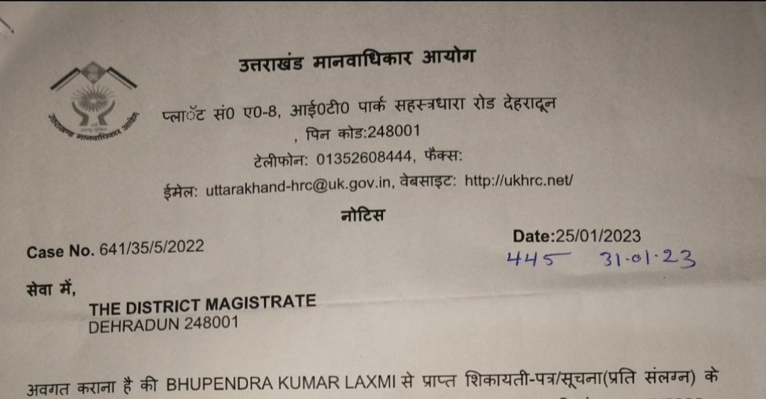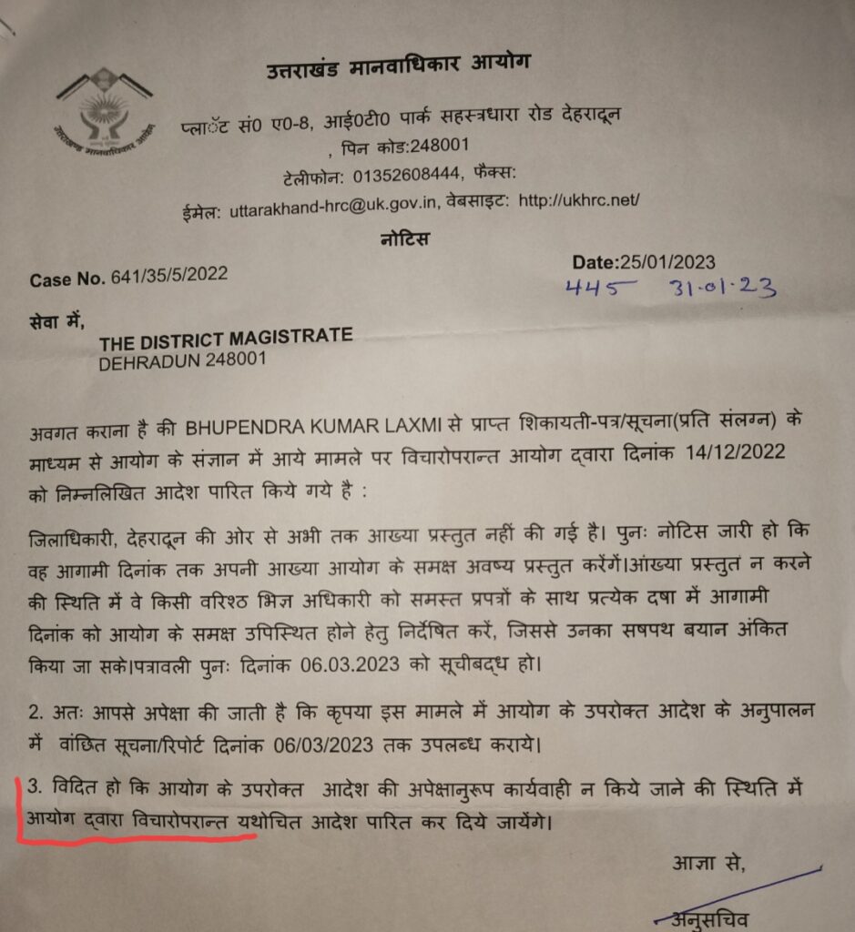 मानव अधिकार आयोग उत्तराखंड द्वारा जनहित याचिका की सुनवाई करते हुए जिलाधिकारी देहरादून को नोटिस जारी कर 4 सप्ताह में प्रकरण से संबंधित आख्या मांगी गई थी, परन्तु जिलाधिकारी द्वारा मामलें से संबंधित अपना जवाब आयोग में प्रस्तुत नहीं किया गया।