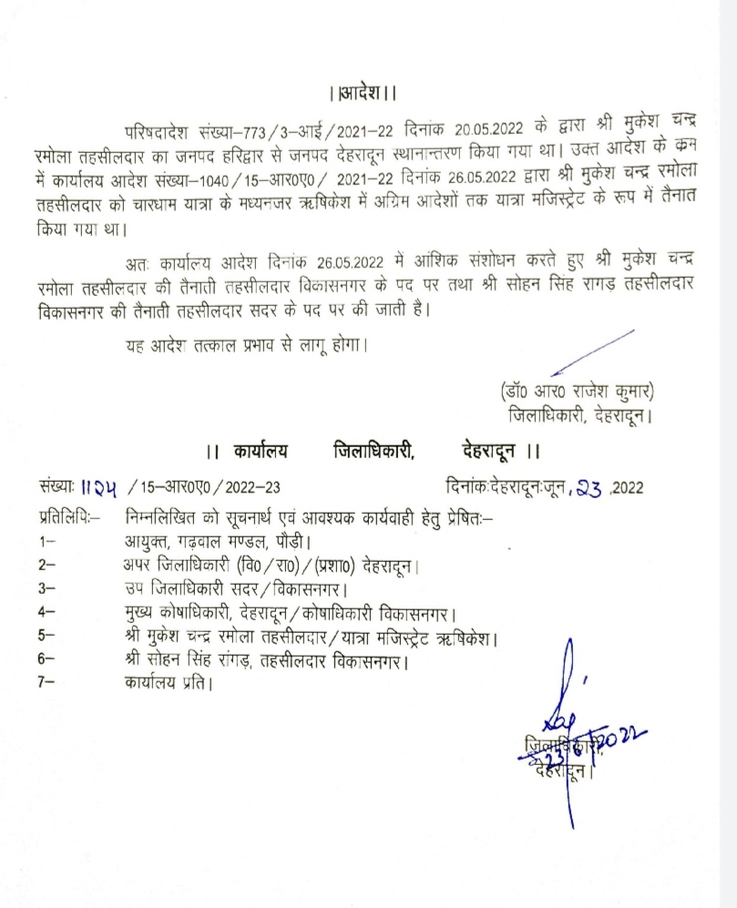 देहरादून तहसीलदार सदर का पद काफी समय से रिक्त चल रहा था दिनांक 20-5-2022 के द्वारा मुकेश चन्द्र रमोला तहसीलदार का जनपद हरिद्वार से जनपद देहरादून स्थानान्तरण किया गया था परंतु मुकेश चन्द्र रमोला तहसीलदार को चारधाम यात्रा के मद्देनजर ऋषिकेश में अग्रिम आदेशों तक यात्रा मजिस्ट्रेट के रूप में तैनात किया गया था।