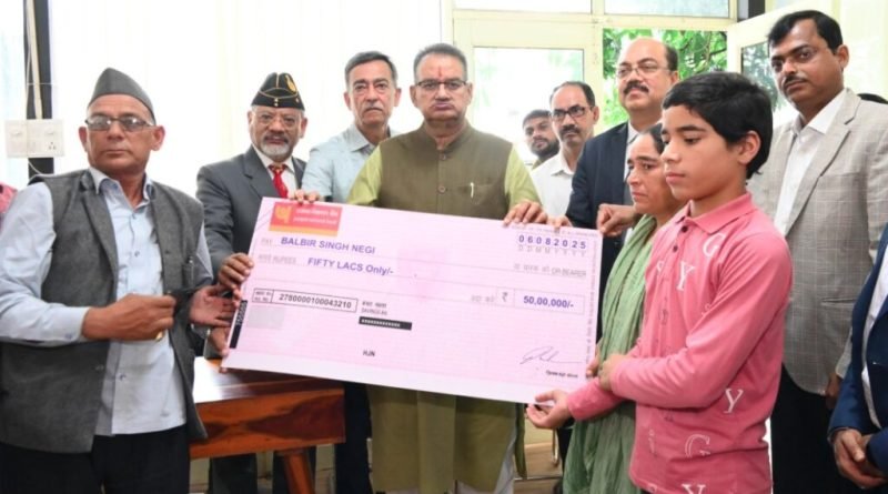 देहरादून। बुधवार को सैनिक कल्याण मंत्री गणेश जोशी ने देहरादून स्थित कैम्प कार्यालय में उपनल के माध्यम से विद्युत विभाग के कार्य करने वाले उपनल कर्मचारी धनवीर सिंह नेगी की आकस्मात मृत्यु होने पर उपनल और पंजाब नेशनल बैंक के बीच हुए करार के क्रम में 50 लाख की धनराशि का चैक मृतक के पिता बलवीर सिंह नेगी तथा उनकी पत्नी मंगीता नेगी का सौंपा। इस दौरान काबीना मंत्री सहित कार्यक्रम में उपस्थित सभी लोगों ने धराली में आयी प्राकृतिक आपदा के दिवंगतजनों को दो मिनट का मौन रखकर श्रद्धांजलि दी और घायल व्यक्तियों के शीघ्र स्वास्थ्य लाभ की कामना की।