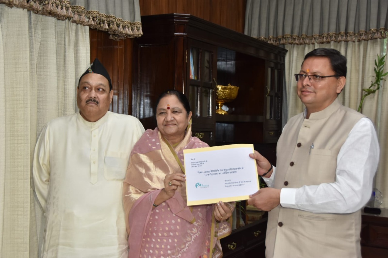 हंस फाउण्डेशन के संस्थापक माता मंगला जी एवं श्री भोले जी महाराज ने सीएम धामी से भेंट कर आपदा पीड़ितों के सहयोग के लिए 11 करोड़ रूपये का चेक सौंपा