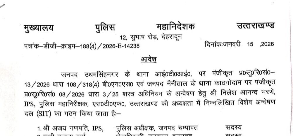 ▪️उक्त प्रकरण से सम्बन्धित अभियोगों की गहन विवेचना हेतु *पुलिस महानिरीक्षक एसटीएफ नीलेश आनन्द भरणे* की अध्यक्षता में *5 सदस्यीय विशेष अन्वेषण दल (SIT)* का गठन किया गया है। SIT में पुलिस अधीक्षक चम्पावत अजय गणपति, क्षेत्राधिकारी टनकपुर वन्दना वर्मा, निरीक्षक दिवान सिंह बिष्ट,जनपद चम्पावत एवं उपनिरीक्षक मनीष खत्री, जनपद चम्पावत को सम्मिलित किया गया है।