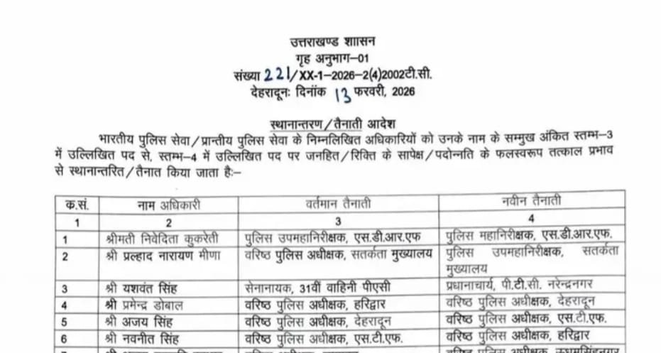सूची में शामिल प्रमुख बदलावों में हरिद्वार, देहरादून, ऊधमसिंहनगर, अल्मोड़ा, बागेश्वर, पिथौरागढ़, चम्पावत, रुद्रप्रयाग सहित अन्य जनपदों के पुलिस अधिकारियों के नाम शामिल हैं। शासन ने स्पष्ट किया है कि सभी अधिकारी तत्काल प्रभाव से नवीन तैनाती स्थल पर कार्यभार ग्रहण करेंगे।