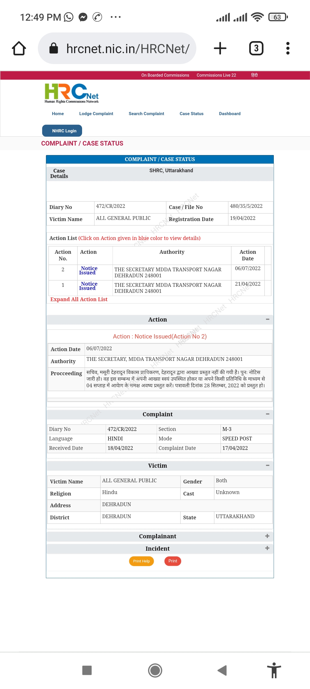 मानव अधिकार आयोग द्वारा प्रकरण की गंभीरता को देखते हुए जनहित याचिका पर तत्काल सुनवाई की गई और एमडीडीए सचिव को नोटिस जारी कर 4 सप्ताह में रिपोर्ट पेश करने हेतु निर्देशित किया गया था ।