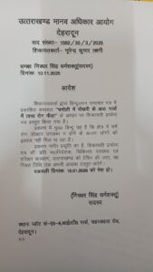 आयोग के सदस्य गिरधर सिंह धर्मशक्तू की पीठ ने प्रकरण को “गंभीर प्रकृति” का बताते हुए शिकायती प्रार्थना पत्र की प्रति महानिदेशक, चिकित्सा स्वास्थ्य एवं परिवार कल्याण, उत्तराखण्ड को प्रेषित कर दी है। महानिदेशक को निर्देश दिया गया है कि वे नियत तिथि तक अपनी आख्या आयोग को प्रस्तुत करें। मामले की अगली सुनवाई 19 जनवरी 2026 को निर्धारित की गई है।