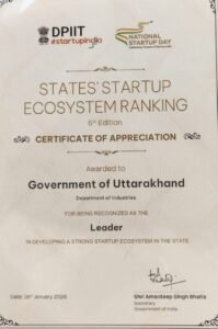 भारत सरकार के वाणिज्य एवं उद्योग मंत्रालय के अंतर्गत उद्योग संवर्धन एवं आंतरिक व्यापार विभाग (DPIIT) द्वारा जारी States’ Startup Ecosystem Ranking (5वां संस्करण) में उत्तराखण्ड को मजबूत स्टार्टअप इकोसिस्टम विकसित करने में ‘लीडर’ के रूप में मान्यता प्रदान की गई है। इस उपलब्धि के लिए राष्ट्रीय स्टार्टअप दिवस के अवसर पर उत्तराखण्ड सरकार के उद्योग विभाग को Certificate of Appreciation प्रदान किया गया।